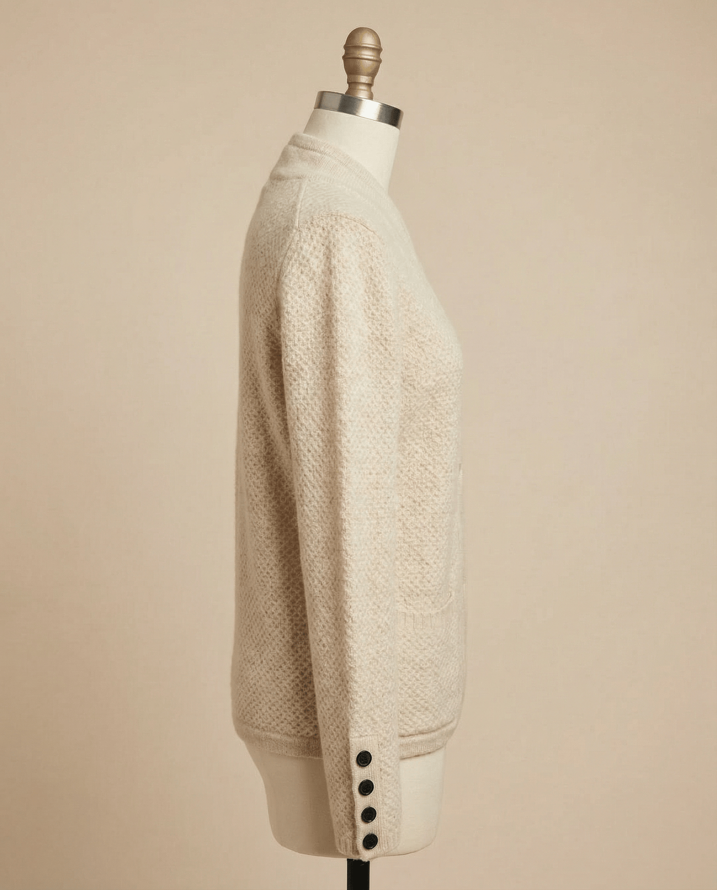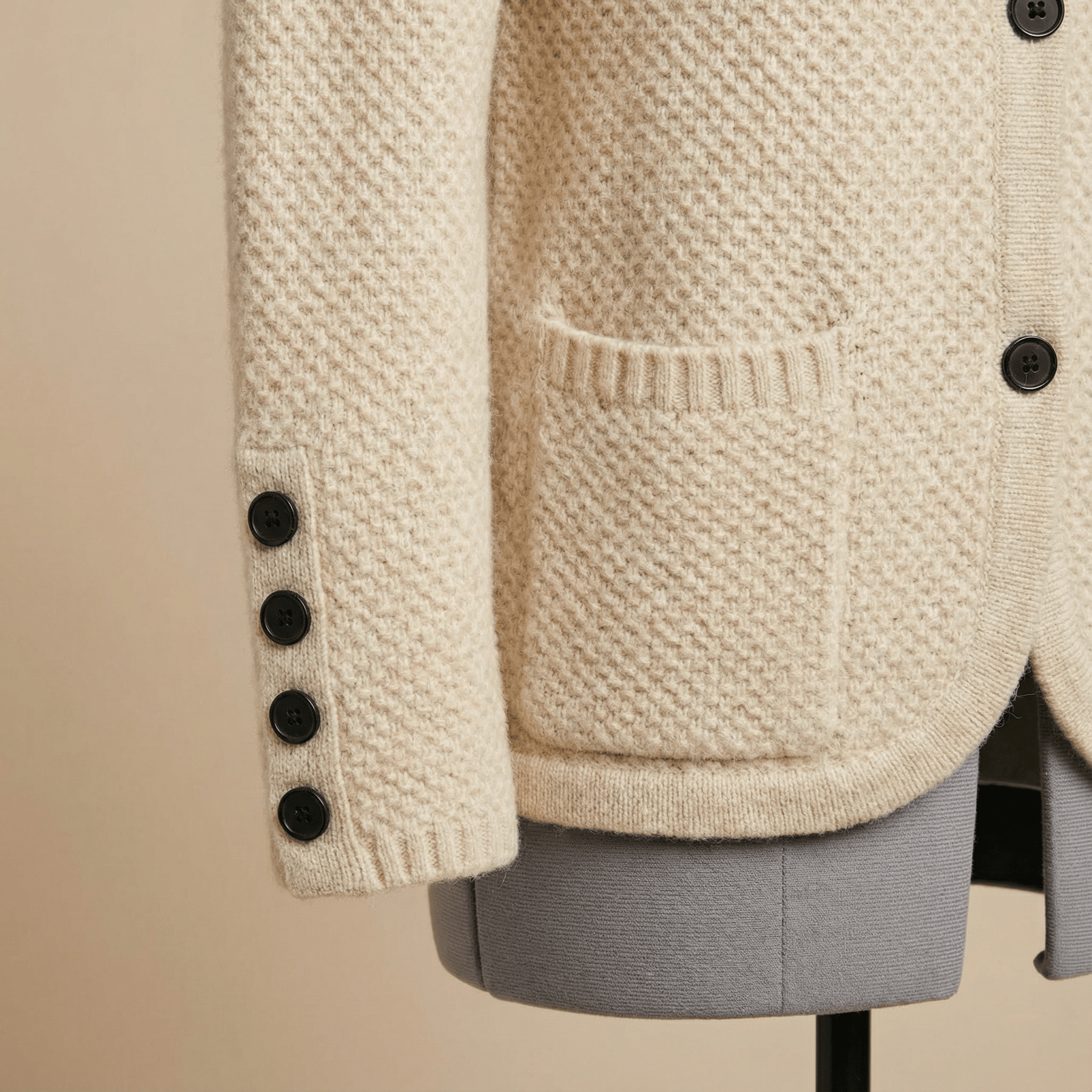 Diseño atemporal – Botonera clásica y puños acanalados que unen tradición y estilo moderno.