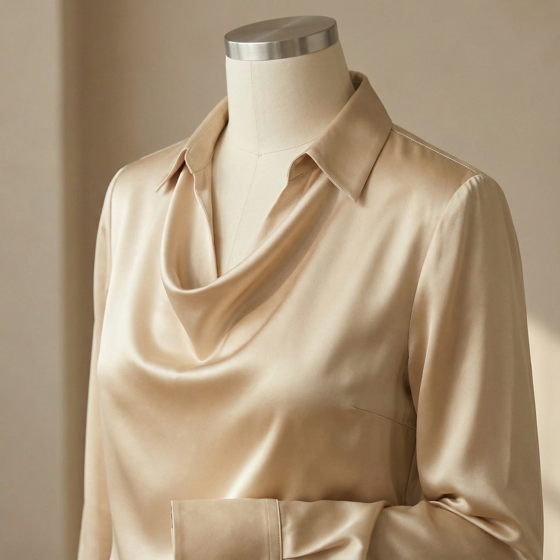 Confeccionada en satén suave y ligeramente elástico, ofrece una sensación lujosa sobre la piel y un ajuste fluido que favorece sin comprimir. Su escote en cascada aporta un toque femenino y refinado, ideal tanto para el día como para la noche, e incluso para elevar tus looks de oficina.